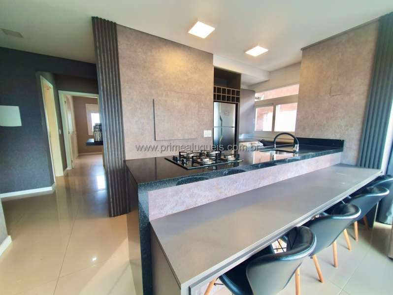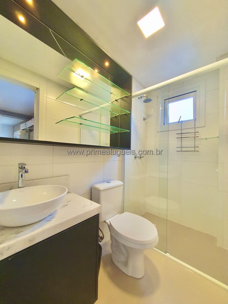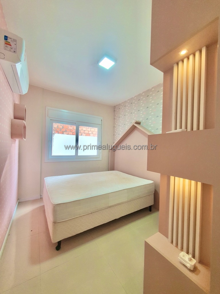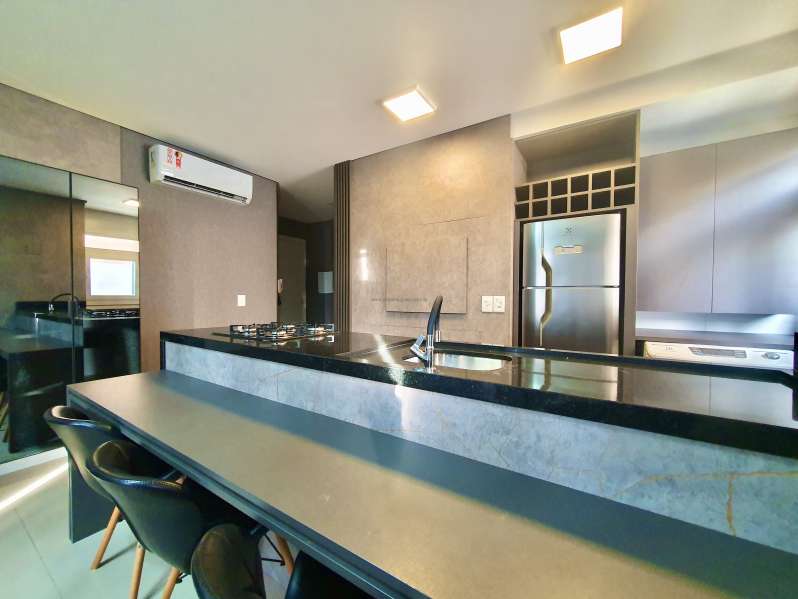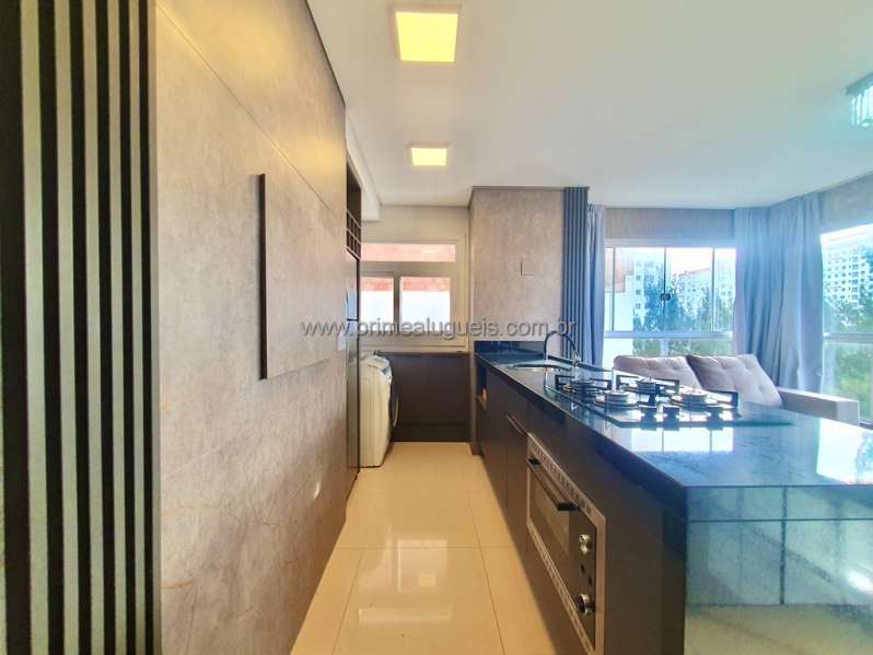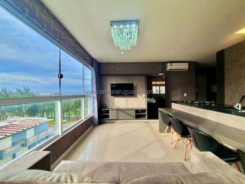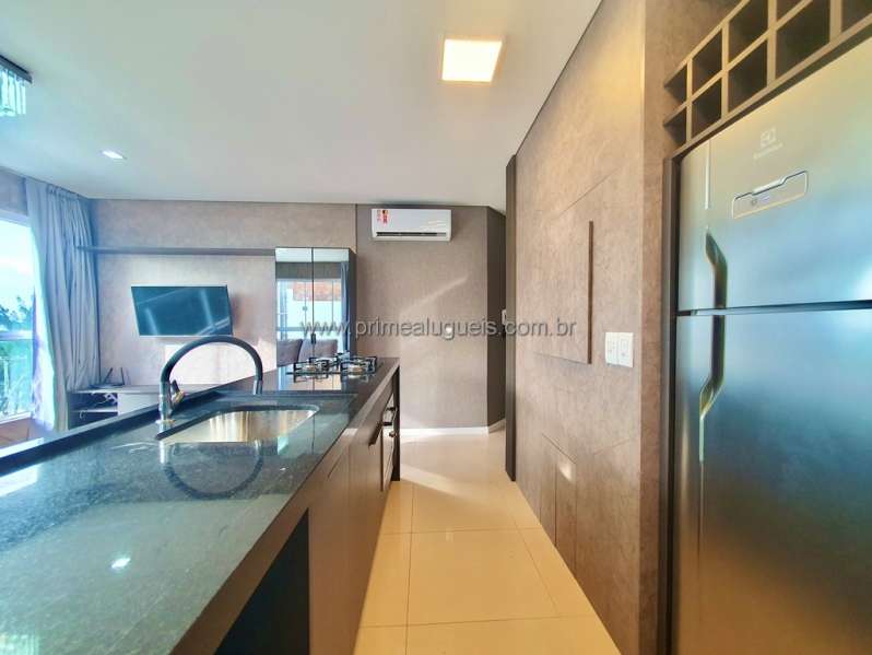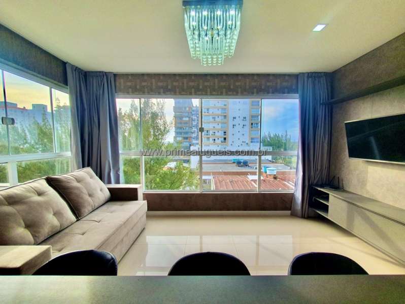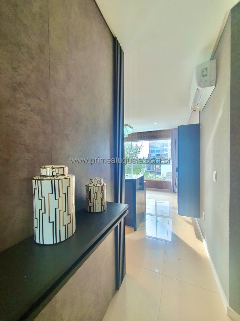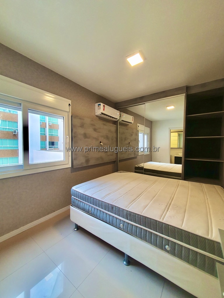 Aluguel Anual: Excelente apartamento mobiliado de frente, todo climatizado, composto por 02 dormitórios (sendo 01 suíte), living integrado a sacada de frente com churrasqueira, cozinha, área de serviço, banheiro social e box de estacionamento para 01 carro.